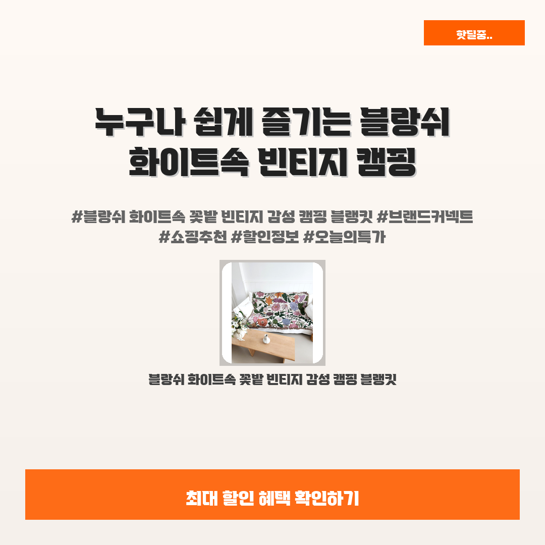 🛍️ 이 포스팅은 네이버 쇼핑 커넥트 활동의 일환으로,판매 발생 시 수수료를 제공받습니다.여러분, 오늘 소개할 제품은..바로 블랑쉬 화이트속 꽃밭 빈티지 감성 캠핑 블랭킷입니다!바쁜 일상 속에서 캠핑의 힐링을 만끽하고 싶은 여러분! 그런데 적절한 분위기를 내는 것이 어렵지 않나요?이 블랭킷은 빈티지 감성을 가득 담고 있어, 캠핑에 특별한 매력을 더해줍니다.아마 여러분도 이런 경험 있을 거예요. 캠핑을 갔는데 풍경이 너무 평범해 보인다는 것!이젠 걱정 마세요! 블랑쉬 화이트속 꽃밭 빈티지 감성 캠핑 블랭킷과 함께라면 완벽한 캠핑 분위기를 연출할 수 있어요!게다가 가격도 기존 59,000원에서 39,000원으로 할인 중이라 가성비도 뛰어나요!직접 사용해보시면 그 만족감을 분명 느끼실 수 있습니다. 지금 바..